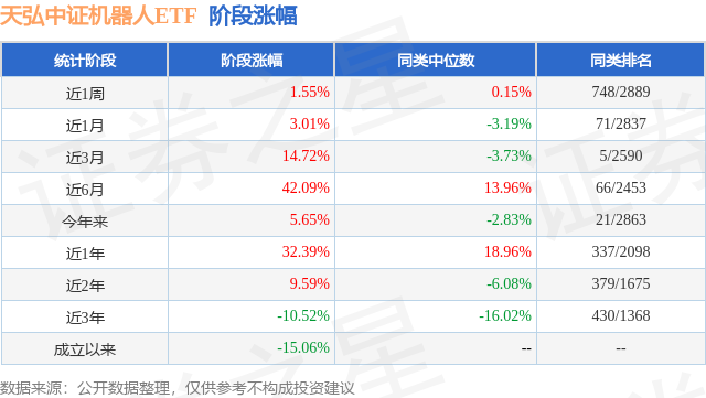 从业绩表现来看,天弘中证机器人ETF基金过去一年净值涨幅为25.81%,在同类基金中排名481/2233,同类基金过去一年净值涨幅中位数为11.94%。而基金过去一年的最大回撤为-26.64%,成立以来的最大回撤为-47.75%。